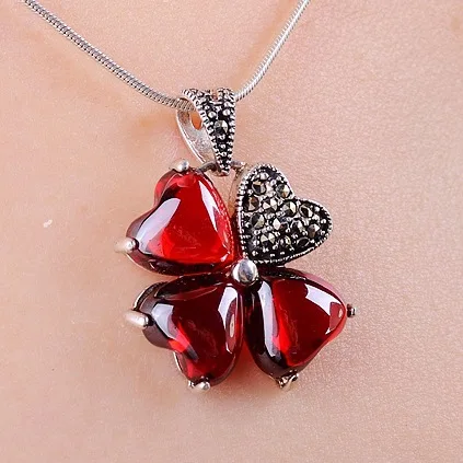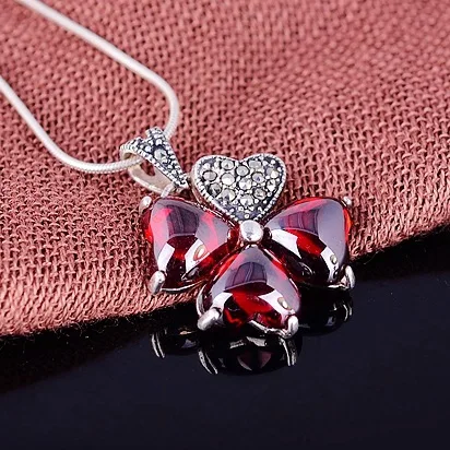 Best 925 Silver Semi-precious stones red necklace Jacinth natural garnet clover plant pendant Women fash