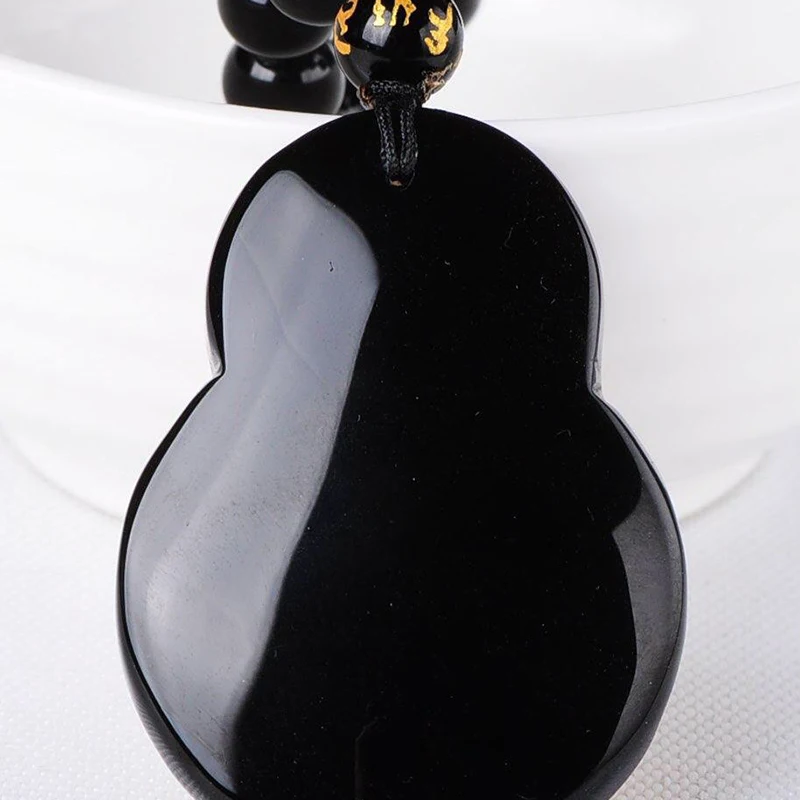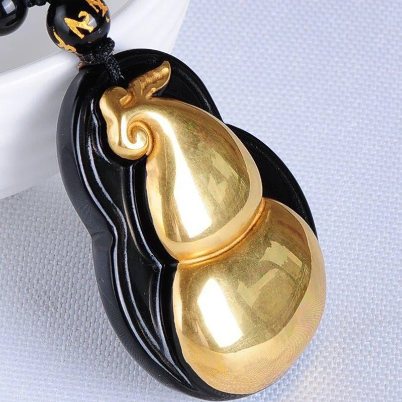 Natural Black Obsidian Carved Gold Color Gourd Lucky Amulet Pendant Necklace For Women Men pendants