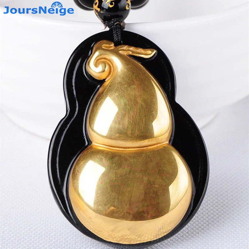 Hot Sale Natural Black Obsidian Carved Gold Color Gourd Lucky Amulet Pendant Necklace For Women Men pendants