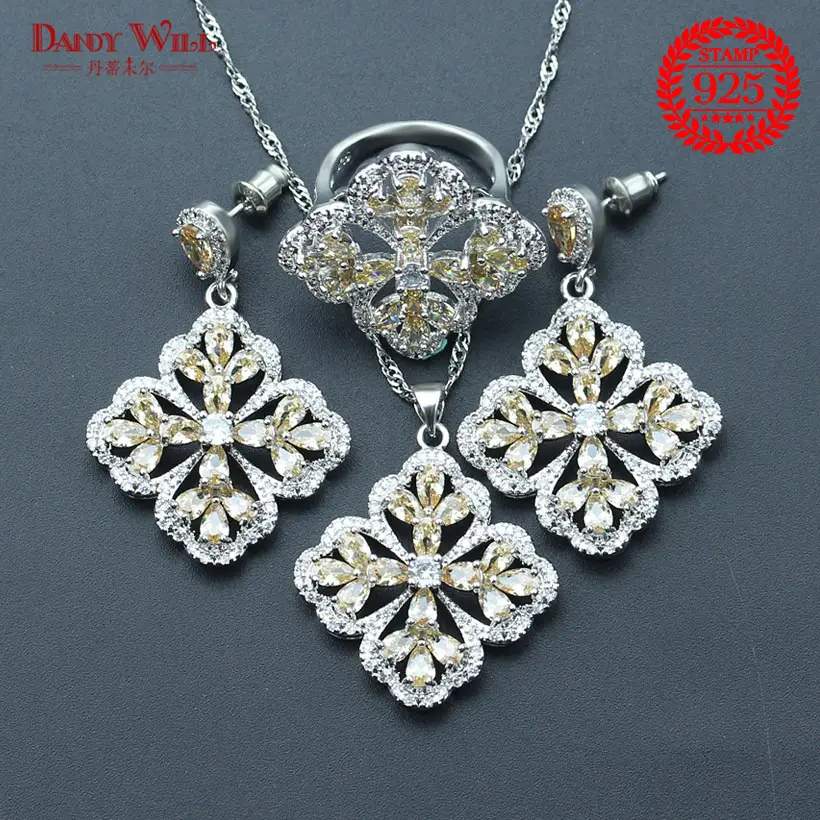 HIGH QUALITY New Silver 925 Wedding Costume Jewelry Sets Champagne Zircon Women Set of Earrings Rings Necklace P