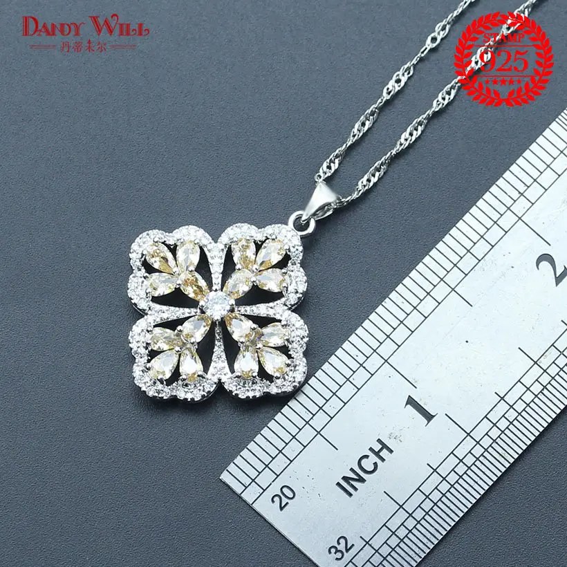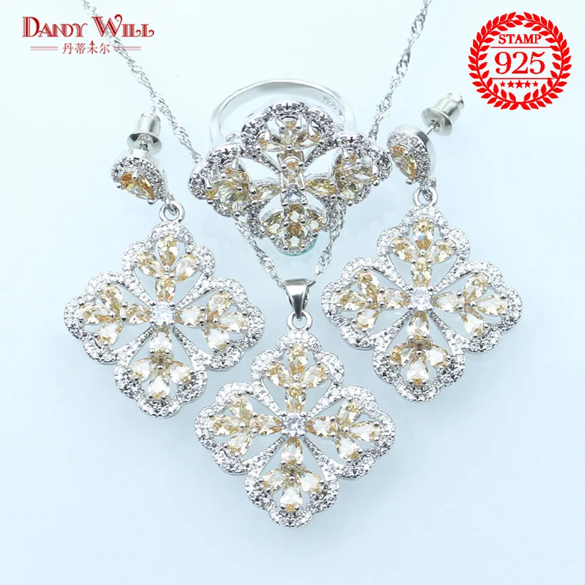 New Silver 925 Wedding Costume Jewelry Sets Champagne Zircon Women Set of Earrings Rings Necklace P