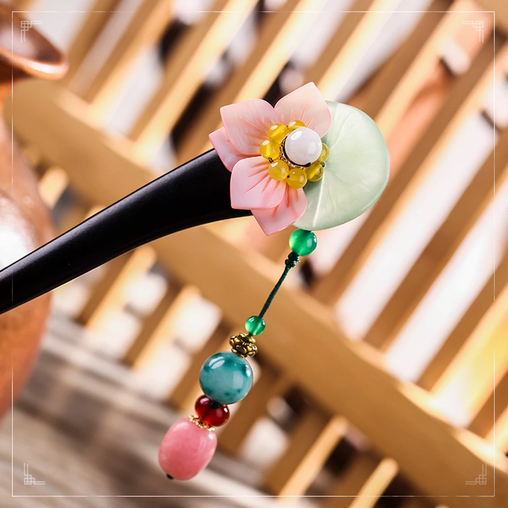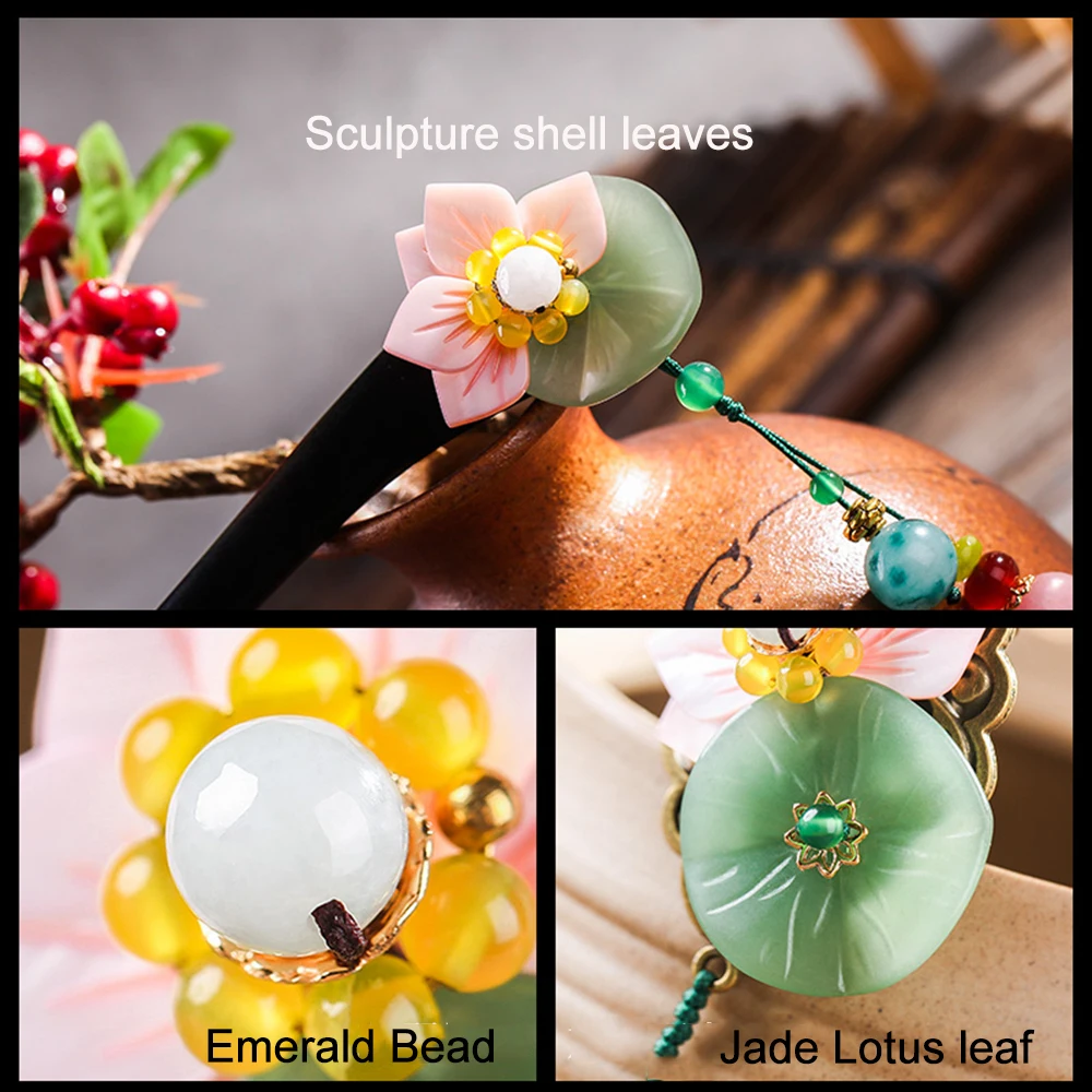 Hot Sale Ethnic Tassel Handmade Pendant Hair Sticks E merald Pink Sculupture Shell Leaves Green Stone Lotus