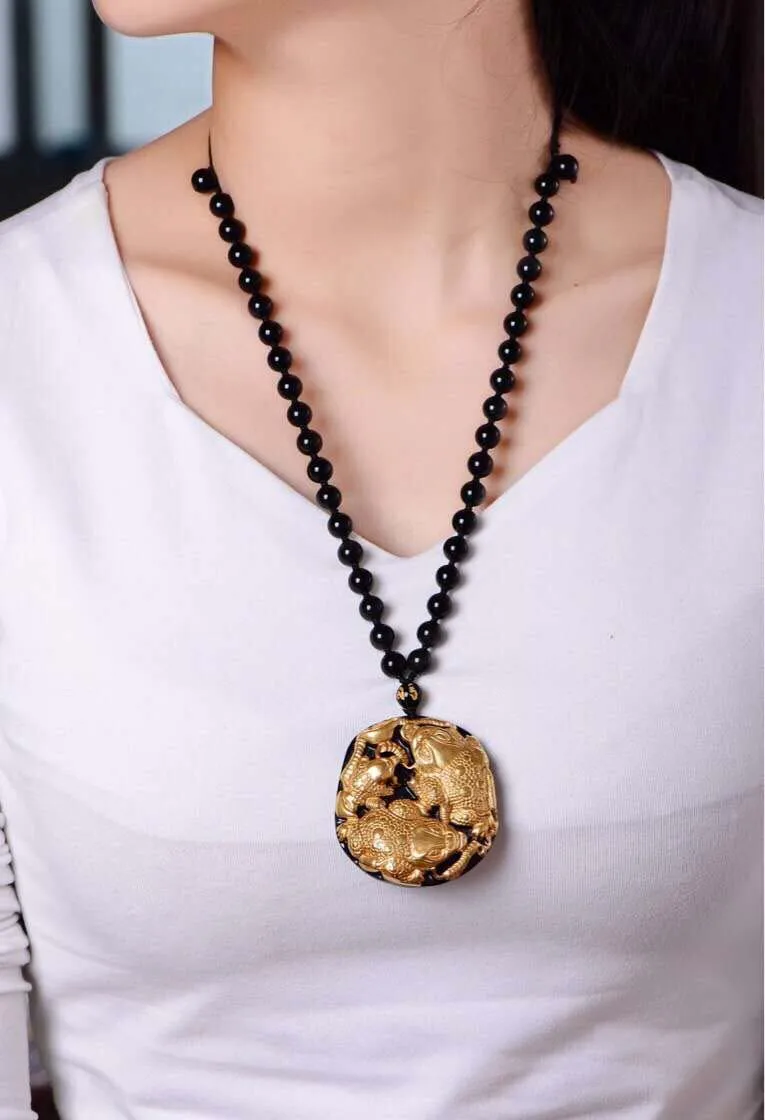 Gold Natural Black Obsidian Carving Gold toad Lucky Amulet Pendant For Women Men pendants Fashion J