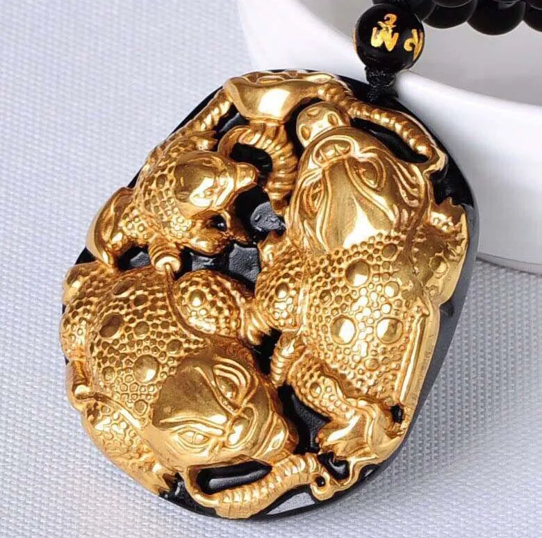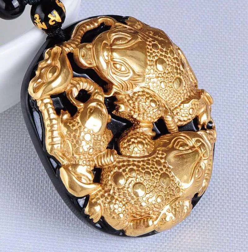 BEST Gold Natural Black Obsidian Carving Gold toad Lucky Amulet Pendant For Women Men pendants Fashion J