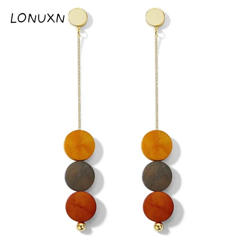 Review Top 9cm high quality 925 silver retro long 3 colors natural wood round earrings women jewelry Tassel ge